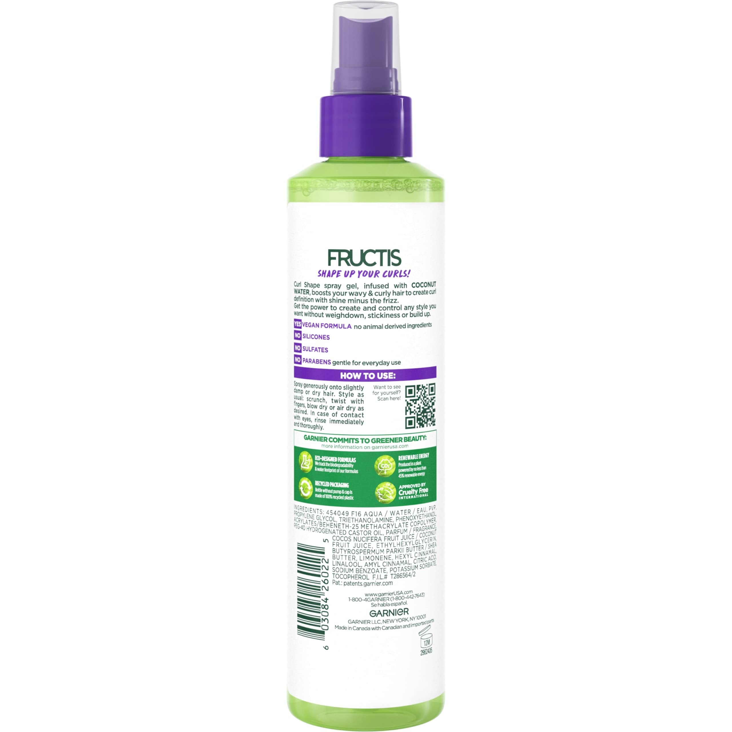 Take control of your style! Garnier Fructis Style Curl Shape Defining Spray Gel boosts your wavy, permed or naturally curly hair to create curl definition with shine minus the frizz. This styling spray gel for curly hair gives you the power to create and control any style you want. HOW DOES IT WORK? This curl spray gel with Shea Butter has powerful holding technologies that provide ultra long-lasting hold without stickiness or buildup. GET INSPIRED! Create a "Dream Curls" look: Apply on slightly damp hair. Twist hair around finger to create ringlets. Blow-dry with diffuser or air-dry to create defined frizz-free curls. Finish any Curl Shape style with Garnier Fructis Hairspray for long-lasting hold. For more looks, tips and fun visit our Style Hub. â Styling spray gel for curly hair creates curl definition â Curl spray gel with Shea Butter provides long-lasting hold without stickiness or buildup â Boosts your wavy, permed or naturally curly hair with definition and shine minus the frizz â Get the power to create and control any curly style you want Spray generously onto slightly damp or dry hair. Scrunch hair, blow-dry or air-dry. Brand Story By Garnier Fructis
