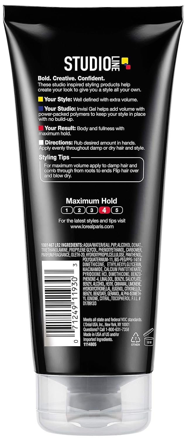 Get a defined, full look with volume, body and maximum hold using the L'Oreal Paris Studio Invisi Gel. This defining hair gel contains a no build-up thickening base to add volume to your hairstyle. For maximum volume, apply to damp hair and comb through from roots to ends. Flip hair over and blow dry. Perfect for short hairstyles and mens hairstyles. • Adds Fullness, Body and Volume • Extreme Hold Defining Hair Gel • No Build-up • Perfect for short hairstyles Rub desired amount in hands. Apply evenly throughout damp or dry hair. Style in any way you choose.