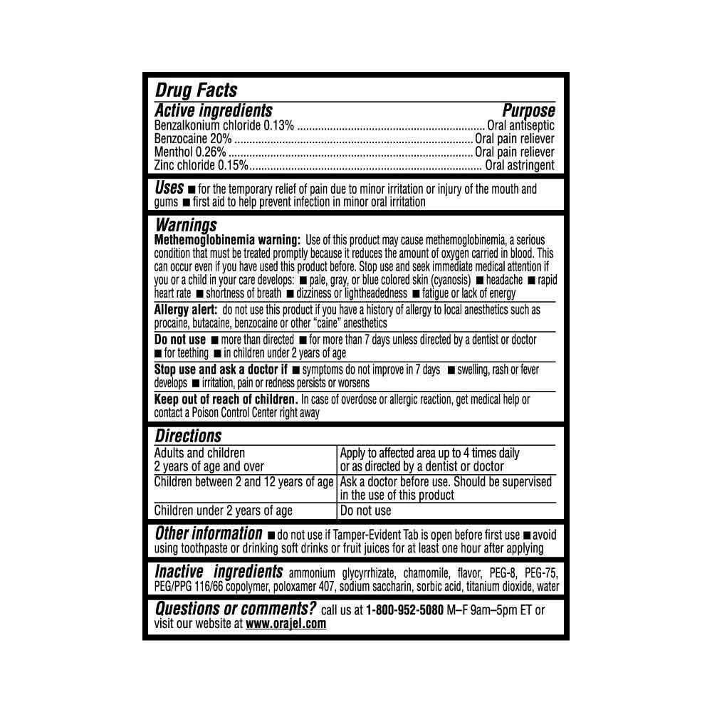For the temporary relief of pain to minor irritation or injury of the mouth and gums. First aid to help prevent infection in minor oral irritation. Ready open tube tip. Instant pain relief. Clinical strength pain relief. Proven to kill harmful bacteria.Active Ingredients: Benzalkonium Chloride 0.13% Benzocaine 20% Menthol 0.26% Zinc Chloride 0.15%