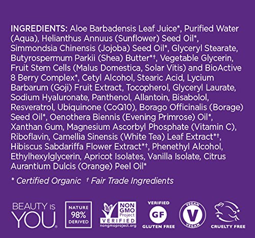 Aloe Barbadensis Leaf Juice*, Purified Water (Aqua), Helianthus Annuus (Sunflower) Seed Oil*, Simmondsia Chinensis (Jojoba) Seed Oil*, Glyceryl Stearate Butyrospermum Parkii (Shea) Butter*, Vegetable Glycerin Fruit Stem Cells (Malus Domestica, Solar Vitis) and BioActive 8 Berry Complex*, Cetyl Alcohol, Stearic Acid, Lycium Barbarum (Goji) Fruit Extract, Tocopherol, Glyceryl Laurate, Sodium Hyaluronate, Panthenol, Allantoin, Bisabolol, Resveratrol Ubiquinone (CoQ10), Borago Officinalis (Borage) Seed Oil*, Oenothera Biennis (Evening Primrose) Oil*, Xanthan Gum, Magnesium Ascorbyl Phosphate (Vitamin C), Riboflavin, Camellia Sinensis (White Tea) Leaf Extract*, Hibiscus Sabdariffa Flower Extract*, Phenethyl Alcohol, Ethylhexylglycerin, Apricot Isolates, Vanilla Isolate, Citrus Aurantium Dulcis (Orange) Peel Oil