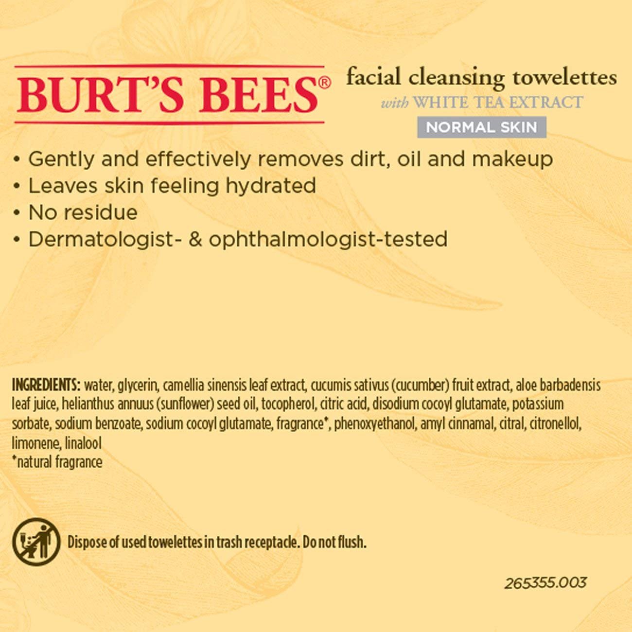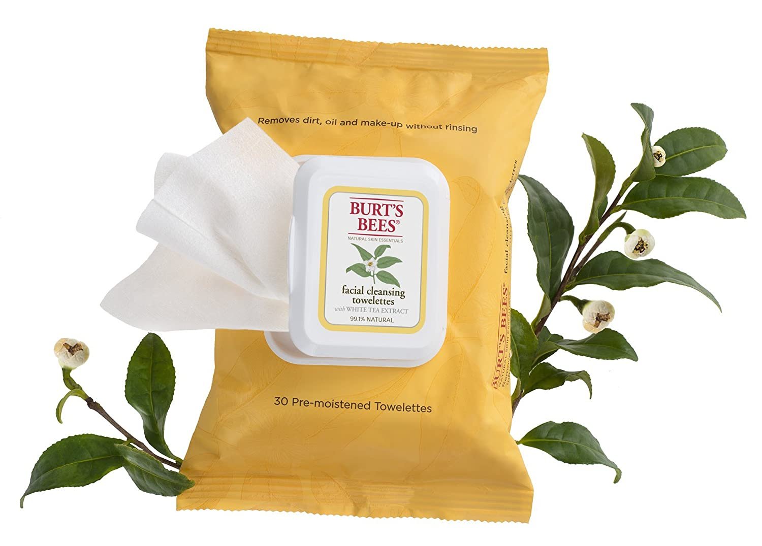 Burt's Bees Facial Cleansing Towelettes, White Tea Extract, cleanse your face in one easy step without ever having to rinse. They are specially formulated for all skin types. They gently remove dirt, oil, and makeup. Infused with white tea extract, calming cucumber and aloe, they leave your skin feeling smooth and naturally clean. They are 99.1% natural, dermatologist and ophthalmologist-tested and contain no parabens, phthalates or petrolatum. Since no rinsing is necessary, you can use these disposable wipes anytime, anywhere.