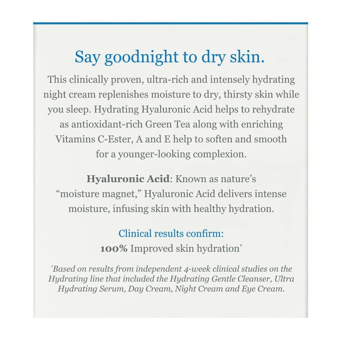 This clinically proven and dermatologist recommended ultra-rich intensely hydrating night cream replenishes moisture to dry, thirsty skin as you sleep. Hydrating Hyaluronic Acid helps to rehydrate as antioxidant-rich Green Tea along with enriching Vitamins C-Ester, A and E help to soften and smooth for a younger-looking complexion. Hyaluronic Acid: Known as natureÃs Ãmoisture magnet,Ã Hyaluronic Acid delivers intense moisture, infusing skin with healthy hydration. Vitamin E: Rich antioxidant helps repair free radical damage & improve the appearance of skin's texture 4-week Clinical Results confirm: 100% Improved skin hydration Notes: Based on results from independent 4-week clinical studies on the Hydrating line that included the Hydrating Gentle Cleanser, Ultra Hydrating Serum, Day Cream, Night Cream and Eye Cream.