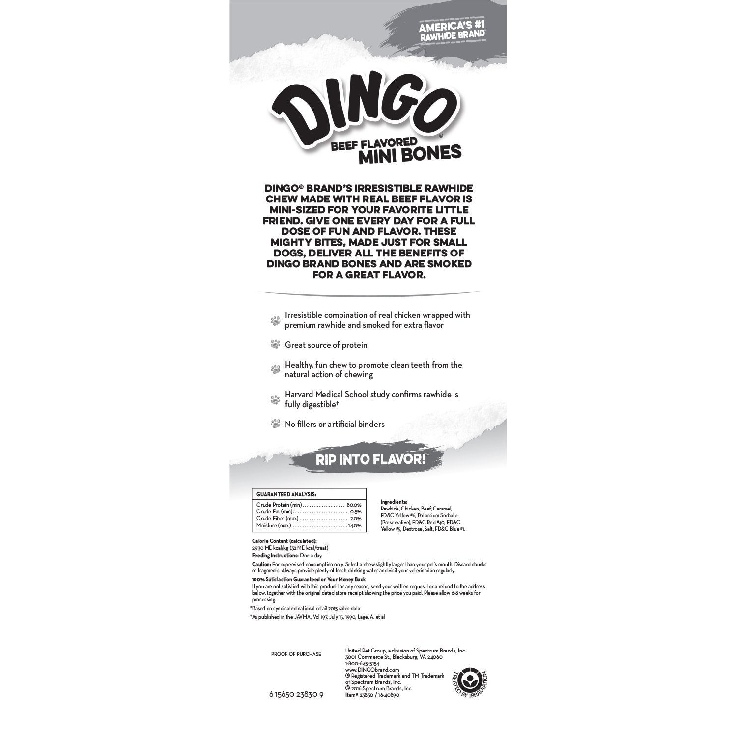 The Dingo brand combines powerful flavors and benefits to create bones, chews and treats that are sure to keep you and your dog wanting more. With a wide variety of shapes and flavors, there are options for any size companion. Dingo Brand's irresistible rawhide chews with real beef flavor is mini-sized for your favorite little friend. Give one to your pet every day for a full dose of fun and flavor. These mighty bites, made just for small dogs, deliver all the benefits of Dingo Brand bones with a great smoky flavor. The beef flavored mini bone is also packed with protein and is 98% fat free! This healthy, fun chew promotes clean teeth by preventing tartar buildup from the natural action of chewing. Whether your pet has been especially good or you simply want to show your love, let your dog rip into flavor with Dingo Beef Flavored Mini Bones! The Story Behind the BoneIn the 1990's, the Dingo brand started with a man named Les and his dog, Dingo. Like most dogs, Dingo had an instinctual need to chew, and to his owner's dismay, Dingo enjoyed gnawing on furniture and destroying shoes. In hopes of fixing Dingo's behavioral problems, Les attempted replacing shoes with rawhide bones. Unfortunately, Dingo was not a fan of these traditional rawhide chews. Rather than giving up hope, Les searched for an alternate solution. Coincidentally, Les's wife worked for a jerky company, and Dingo loved the jerky treats. Due to Dingo's adoration of the jerky, Les began soaking the traditional rawhide bones in water and filling them with jerky, leaving some jerky around the edges for Dingo to see. And with that, the Dingo bone was born. Finally, Dingo had a treat that he loved, while still being able to fulfill his chewing needs. Now your dog can enjoy the original Dingo chew in the form of mini bones.