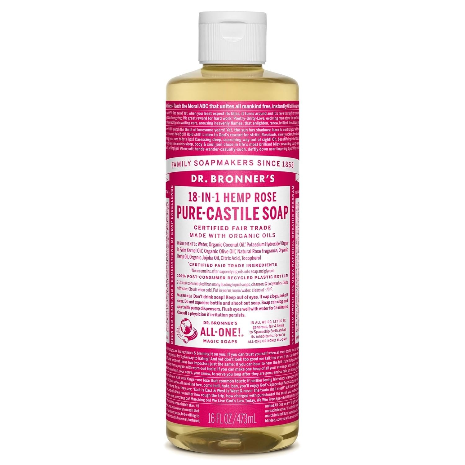 Dr. Bronner's - Pure-Castile Liquid Soap (Rose, 16 ounce) - Made with Organic Oils, 18-in-1 Uses: Face, Body, Hair, Laundry, Pets and Dishes, Concentrated, Vegan, Non-GMO