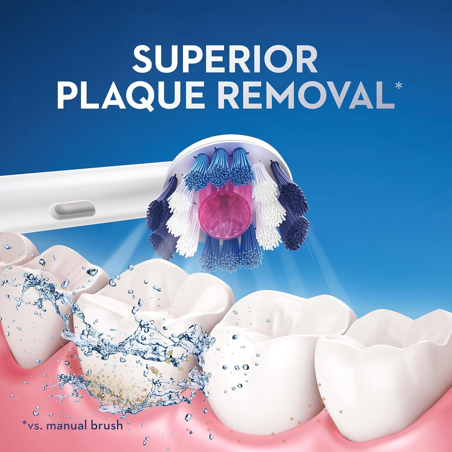 Trust the consistent battery performance of the Oral-B 3D White toothbrush to remove plaque and whiten teeth by removing surface stains. The 3D White round brush head is inspired by dental professional tools for a tooth-by-tooth clean, with specially engineered bristles for optimal tooth coverage.