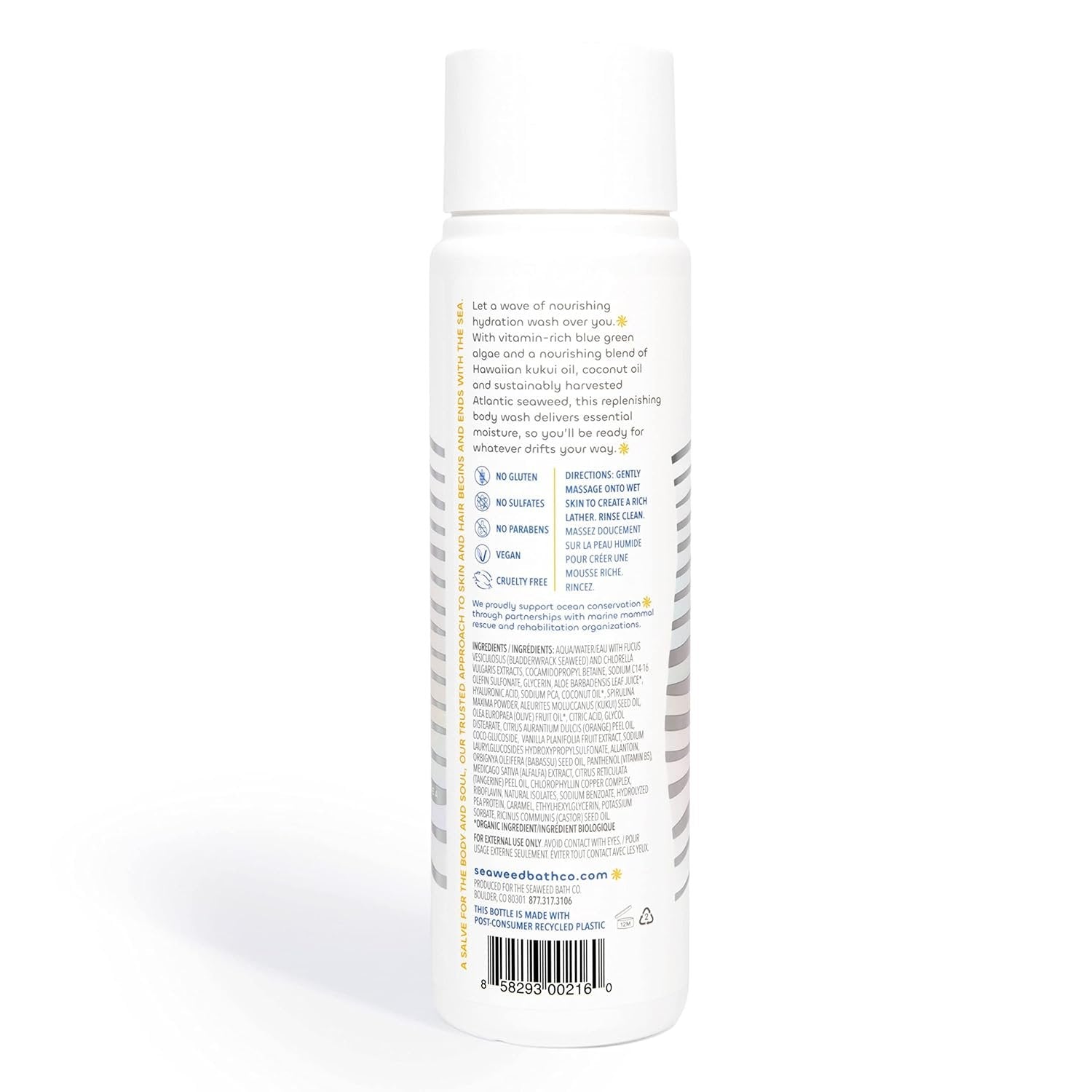 Unlock the magic of the sea with Seaweed Bath Co. Hydrate Body Wash. This body wash is made with sustainably harvested Atlantic seaweed and vitamin-rich blue green algae plus a nourishing blend of Hawaiian kukui and coconut oils to leave skin silky smooth. Inspired by the idea that nature already knows, we started with a centuries old remedy - seaweed baths - while on a personal journey to find a better troubled skin solution. Since then, Seaweed Bath Co. has continued to use sustainable practices to unlock the nourishing and restorative gifts of the ocean, harnessing its benefits in every product we make. We proudly support ocean conservation through partnerships with marine mammal rescue and rehabilitation organizations.
